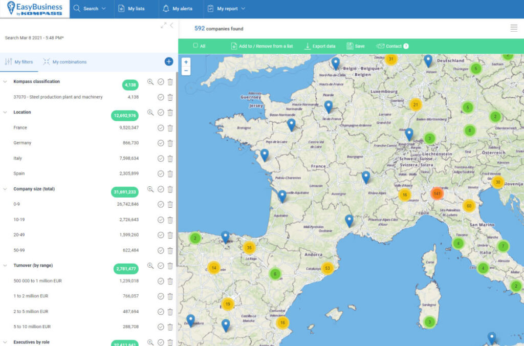 EasyBusiness 서비스의 중심은 Kompass 데이터베이스입니다. 전 세계에 4,400만 개 이상의 기업이 등록되어 있는 이 데이터베이스는 세분화, 전망, 잠재 고객 발굴 및 판매와 같은 프로세스를 간소화할 수 있는 강력한 도구입니다.