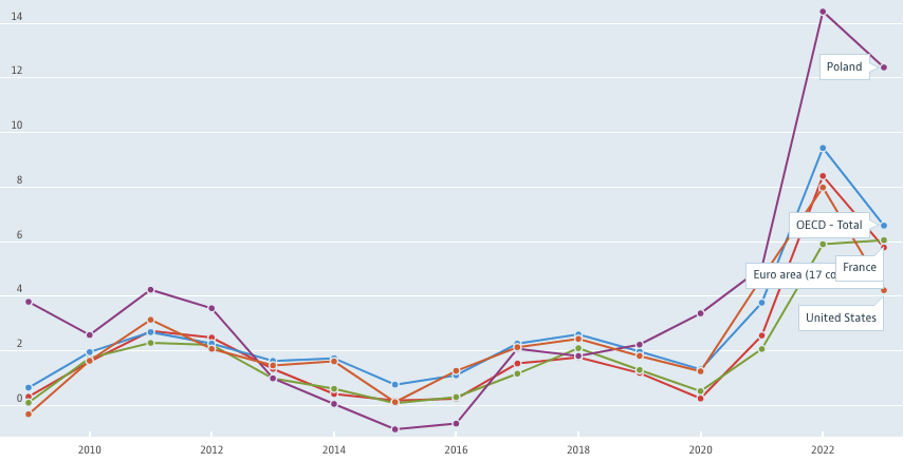 인플레이션은 물가의 일반적인 변화를 측정합니다. OECD에 따르면 이것은 일반적으로 가구가 구입하는 상품 및 서비스 바구니의 가격 변화로 정의됩니다. 아래 그래프에서 보이는 것처럼, 인플레이션 예측은 나라에 따라 다양하며 OECD 수준에서 2023년 평균 인플레이션은 6.6%로 예상되며 미국에서는 4.2%, 프랑스에서는 6.1%, 폴란드에서는 12.4%로 예측됩니다.