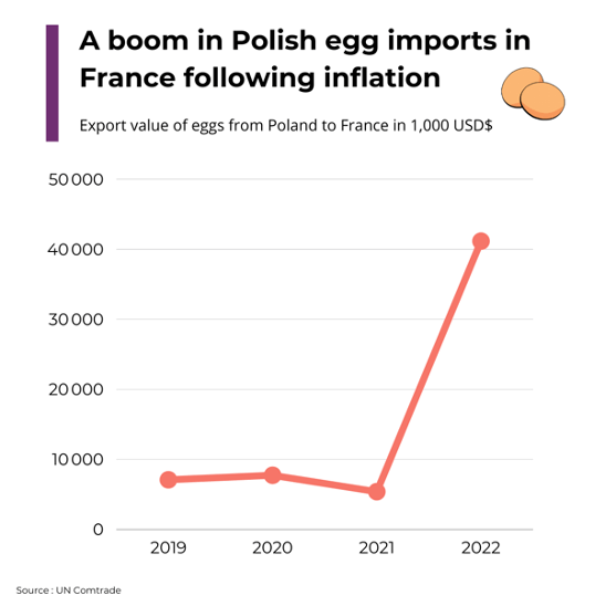 귀하의 수출 대상 국가에서 인플레이션이 급증하면 경쟁사의 가격도 상승합니다. 결과적으로 소비자는 경쟁사가 운영하는 국가 내에서 귀하의 제품으로 기울어질 가능성이 더 높아집니다. 결과적으로 귀하의 경쟁력이 증가합니다. 예를 들어, 2022년에 프랑스에서는 식품 산업용으로 사용되는 계란의 가격이 31% 상승했습니다. 이 상황은 스페인과 폴란드에서의 수입을 크게 증가시켰습니다. 계란은 필수 소비지출이지만 프랑스 소비자들 사이에서는 비교적 안정적으로 유지되었습니다. 프랑스의 주요 비즈니스 신문인 Les Echos에 따르면, 2022년에 폴란드는 14,600톤과 14,200톤의 각각 수입으로 프랑스의 주요 계란 수출국으로 나섰습니다. 요약하면 프랑스의 인플레이션 환경으로 인해 폴란드와 스페인 계란이 프랑스 계란에 비해 가격 경쟁력을 크게 얻게되었습니다. 동반되는 그래프는 2022년 동안 폴란드 계란 수입 증가를 나타냅니다.