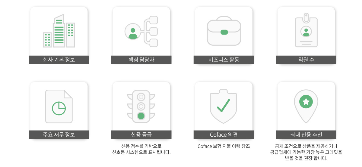 Coface고유의 보험 지불 이력과 결합된 비즈니스 파트너의 종합적인 신용정보를 제공합니다.